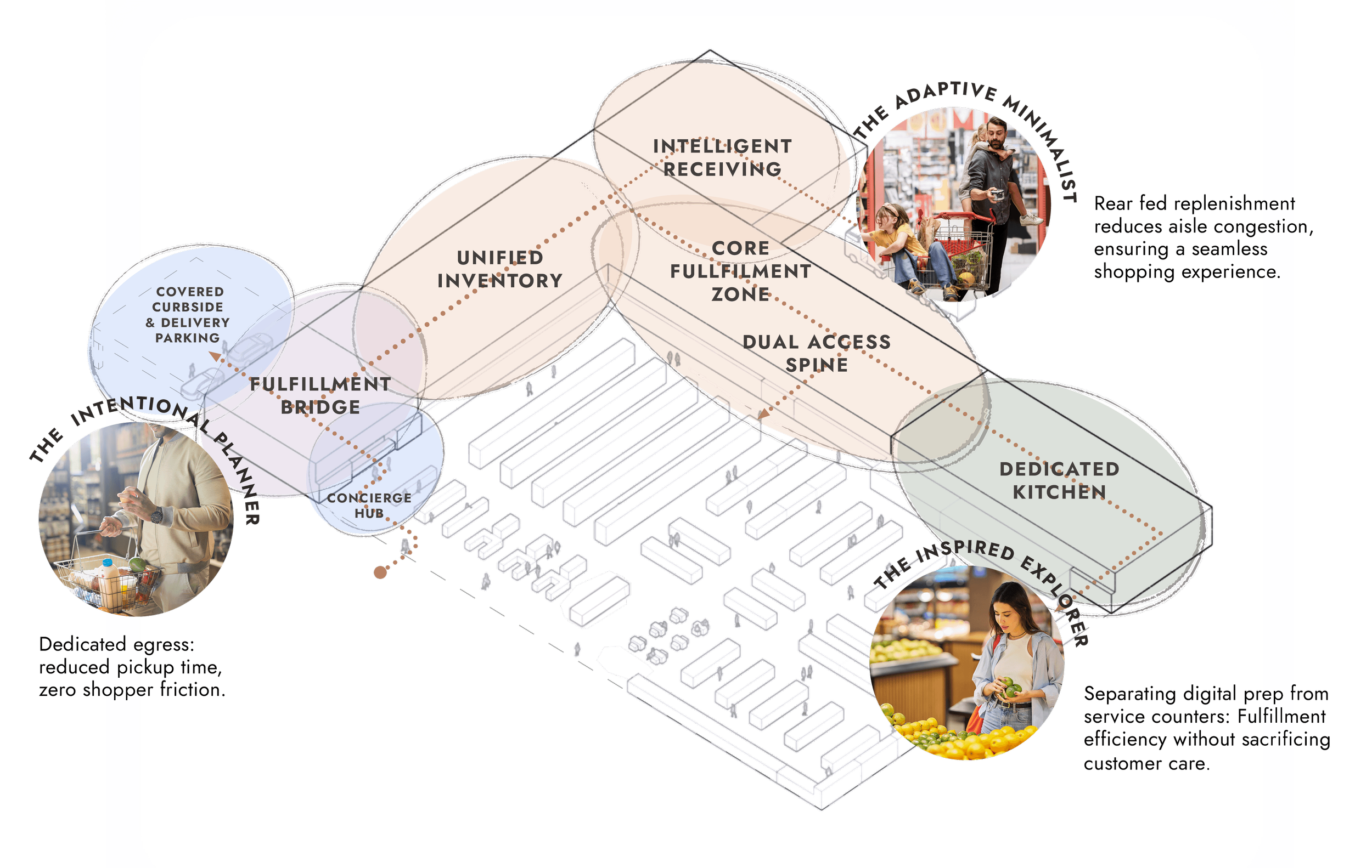 A dedicated Core Fulfillment Zone, anchored by a production kitchen, supports high-velocity digital orders without disrupting the in-store experience.
